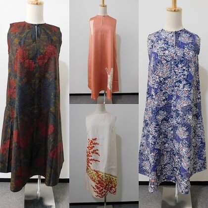 これまで何点もの着物・帯リメイクありがとうございました。あのまま捨てられるしかなかった着物が再生して、日々の生活に彩りを与えてくれました。数十年を経ているものの、着物の生地自体は良いものなので、おしゃれ着として活躍しています。留袖ドレスも面白いデザインで、晴れの日だけでなく普段の外出着としても活躍しています。帯のトートバックも容量があり、買い物袋が有料になっている今、重宝しています。洗濯も手洗いで大丈夫なので、おしげなく外出の際には極力着ています。ていねいな仕事、応対ありがとうございました。